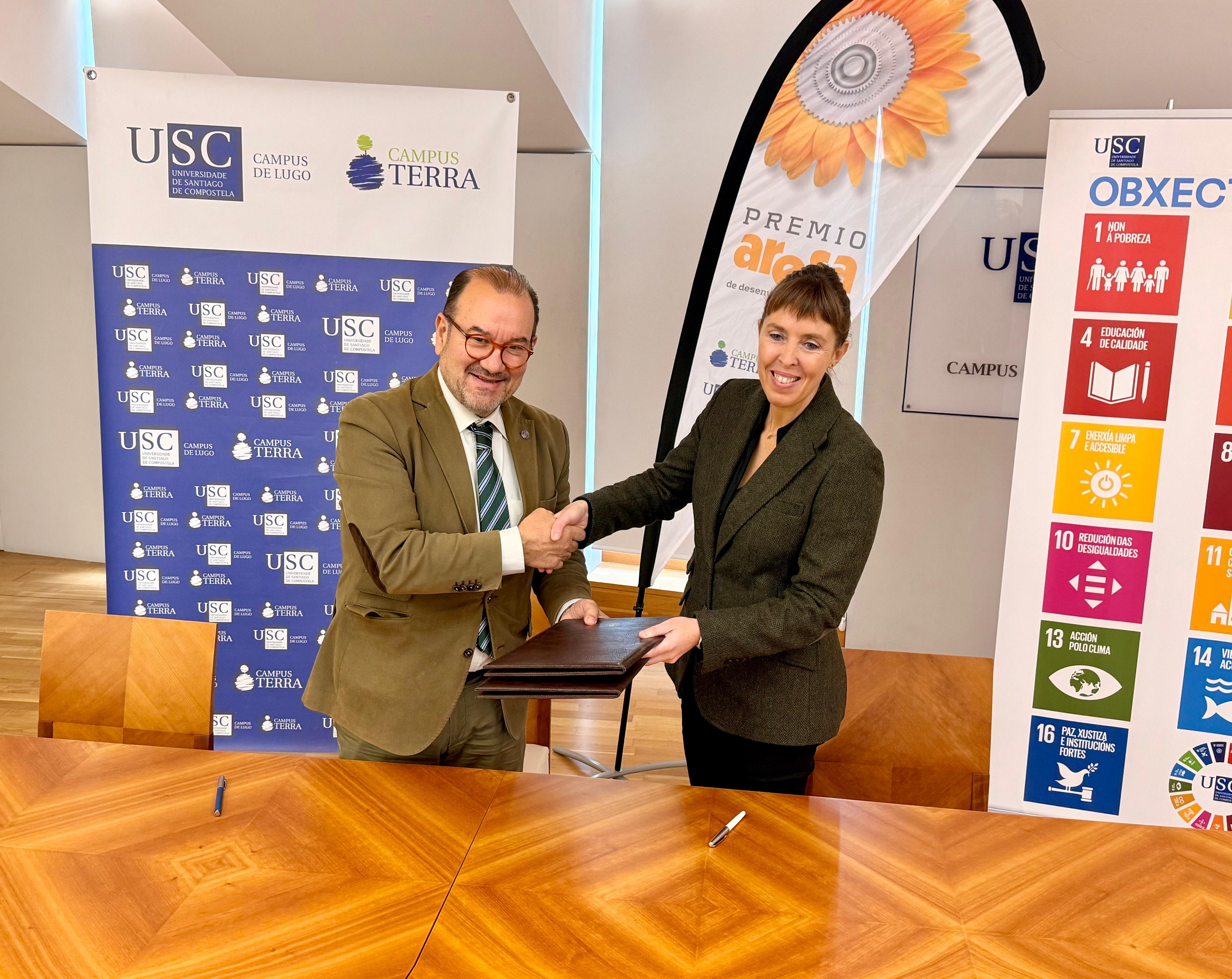 O Premio Aresa de desenvolvemento rural, convocado conxuntamente pola Universidade de Santiago de Compostela e a empresa Aresa con carácter anual, chega xa á súa vixésimo sexta edición logo de que o reitor Antonio López Díaz e a presidenta da compañía Carlota López Pardo asinasen este mércores 26, no Pazo de Montenegro, o convenio que regula as bases do certame. A presentación das candidaturas, acompañadas dos traballos e outra documentación xustificativa, farase no rexistro electrónico da USC e nas Oficina de asistencia en materia de rexistros dos campus universitarios de Lugo ou de Santiago, antes do día 16 de xaneiro de 2026. As candidaturas deben ir dirixidas á Vicerreitoría de Organización Académica e do Campus de Lugo. No acto de sinatura tamén estiveron presentes o vicerreitor de Organización Académica e Campus de Lugo, Francisco Fraga, e o catedrático José Luis Benedito Castellote.