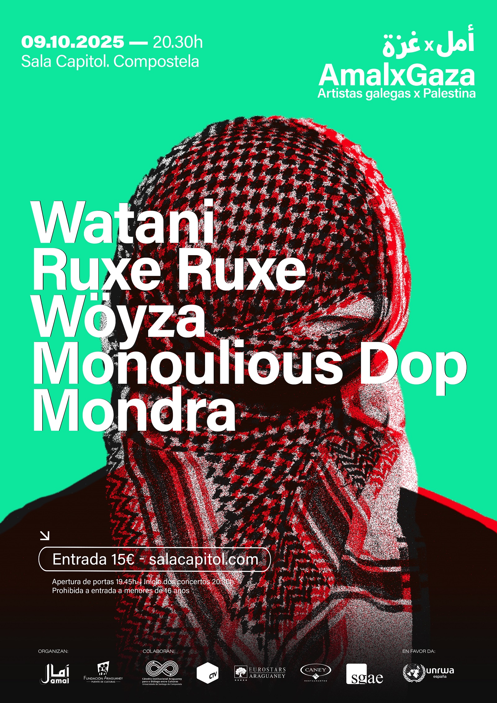 Watani, Ruxe Ruxe, Wöyza, Monoulious Dop e Mondra subirán o 9 de outubro ás 20.30 horas ao escenario da Sala Capitol no concerto solidario AMALxGAZA (artistas galegas x Palestina) que organizan a Cátedra USC-Araguaney para o Diálogo entre Culturas e a Fundación Araguaney–Puente de Culturas. O recadado será destinado á Axencia das Nacións Unidas para as persoas refuxiadas de Palestina en Oriente Próximo (UNRWA).