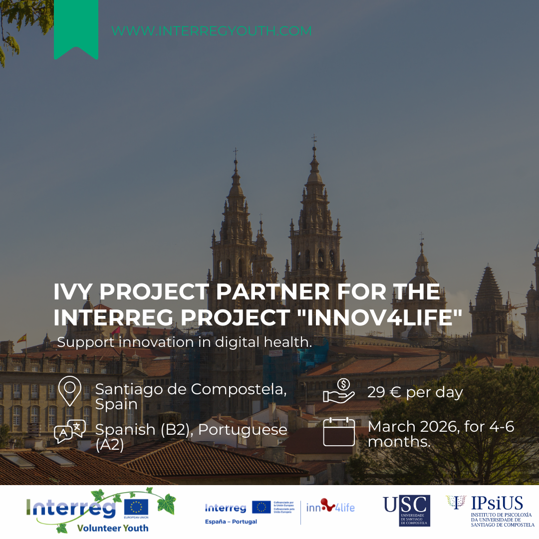 A Universidade de Santiago de Compostela, a través do programa Interreg Volunteer Youth (IVY), ten abertas as candidaturas para colaborar co proxecto europeo Interreg POCPEP “INNOV4LIFE- Ecosistema Transfronteirizo de Innovación Colaborativa en Saúde Dixital”