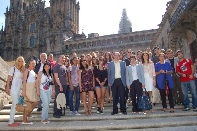 Un grupo de estudantes Erasmus participou este mércores en Santiago no encontro que anualmente organizan as tres Universidades galegas para dar a coñecer o sistema universitario á vez que achegarlles o contorno social e cultural dos lugares nos que estudan. Con carácter rotatorio, este ano correspondeulle á institución compostelá reunir a todos os estudantes nunha xornada lúdica na que visitaron distintas dependencias da cidade. O grupo de alumnos foi recibido no Salón Nobre de Fonseca polo vicerreitor de Estudantes da USC, Francisco Durán. A continuación dirixíronse ao Pazo de Raxoi onde os concelleiros Mercedes Rosón e Andrés Fariña os acompañaron por un percorrido polo edificio. Seguidamente participaron nunha visita guiada pola Cidade da Cultura. Neste encontro os estudantes estiveron acompañados de representantes das tres Universidades galegas. Da USC participaron a vicerreitora adxunta para estudos de Grao e Posgrao, Isabel González Rey, o asesor de USC Internacional Jacobo Feás, e a directora da Oficina de Información Universitaria, Maribel Braña. Pola Universidade de Vigo asistiron o vicerreitor de Relacións Internacionais, Manolo Fernández; o director da Oficina de Relacións Internacionais, Anselmo Seoane, e a técnica Eva Garea. Da Coruña estaba a vicerreitora de Estudantes, María José Martínez, e o técnico de Relacións Internacionais, Jorge Longarela.