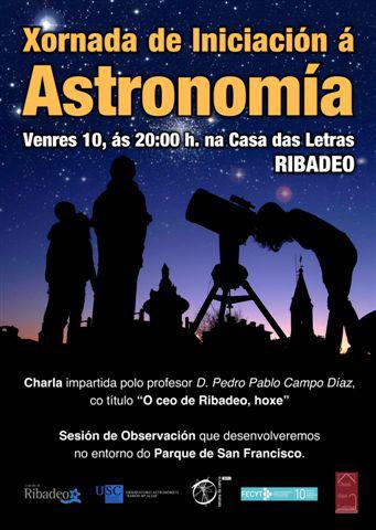 ‘O ceo de Ribadeo, hoxe’ é o título da conferencia que este venres 10 imparte o profesor Pedro Pablo Campo na Casa das Letras de Ribadeo dentro da iniciativa ‘Astronomía Itinerante’ incluída na programación de divulgación do Observatorio Astronómico Ramón María Aller. Esta xornada itinerante de iniciación á astronomía, que este venres tamén chegou á Guitiriz da man do profesor José Ángel Docobo, desenvolverase ás 20.00 horas incluíndo unha sesión de observación. Ademais de Astronomía Itinerante, o Observatorio organizou este curso actividades de astronomía para nenas e nenos, cursiños de iniciación, visitas guiadas ou obradoiros de telescopios, así como o XV Programa de Extensión Cultural de Astronomía, este ano aberto a toda a sociedade.