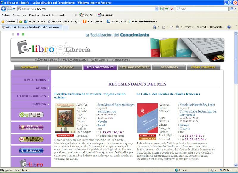 Unha vintena de títulos editados polo Servizo de Publicacións da USC incorporase a e-libro.net, unhas das maiores plataformas internacionais de distribución de contidos dixitais especializado no eido científico-técnico e con intensa presenza en América. Trátase dunha primeira achega que se produce logo dos contactos establecidos polo director do Servizo, Juan Blanco, coa directora para España de e-libro, Victorie Chevalier, na última edición da Feira do Libro española celebrada en outono en Madrid (LIBER). O acordo levou á formalización dun contrato de distribución de contidos dixitais que suporá de xeito inmediato a incorporación á plataforma da práctica totalidade das novidades editoriais da USC. En breve prazo de tempo e tras a sinatura dos correspondentes contratos, estarán tamén dispoñibles para a súa descarga comercial e baixo a protección DRM os ebooks da universidade compostelá nas librarías internacionais de Google Books e Torrossa-Casalini Libri.