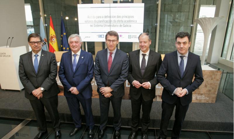 Os reitores das tres universidades galegas e o conselleiro de Educación, Cultura e Ordenación Universitaria asinaron este luns o acordo que define os principios da planificación da oferta académica universitaria no Sistema Universitario Galego (SUG) ata o curso 2020-2021. No acto protocolario presidido polo titular da Xunta de Galicia, Alberto Núñez Feijóo, interviñeron os reitores Juan Viaño, Julio Abalde e Salustiano Mato e o conselleiro Román Rodríguez.